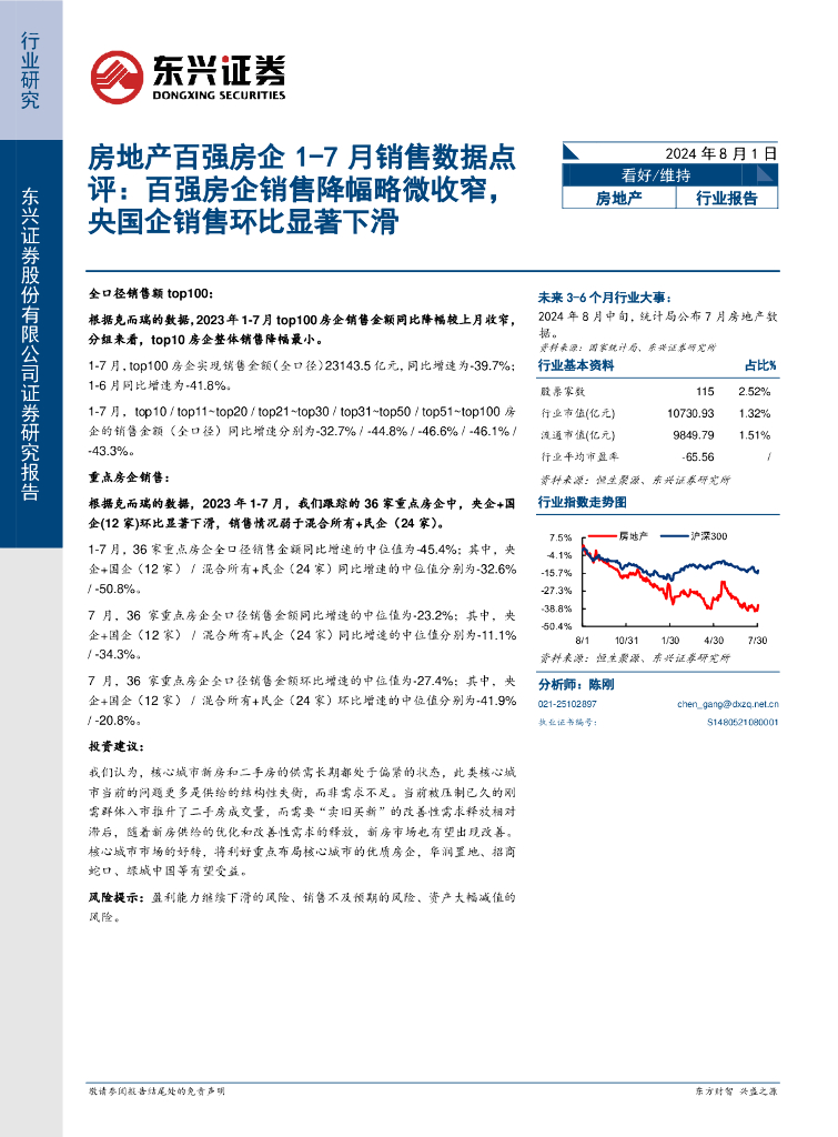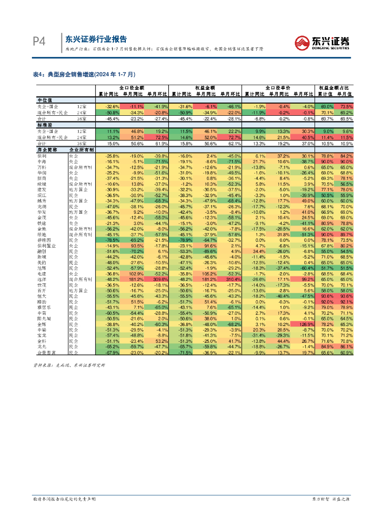 东兴证券:房地产百强房企1-7月销售数据点评:百强房企销售降幅略微收窄,央国企销售环比显著下滑.pdf