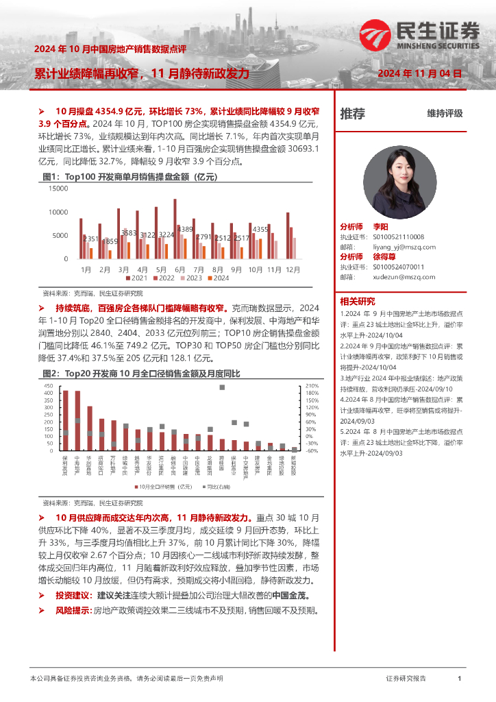 民生证券:2024年10月中国房地产销售数据点评:累计业绩降幅再收窄,11月静待新政发力.pdf