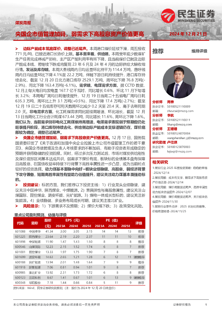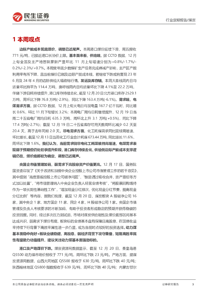 民生证券:煤炭周报:央国企市值管理加码,弱需求下高股息资产价值更高.pdf