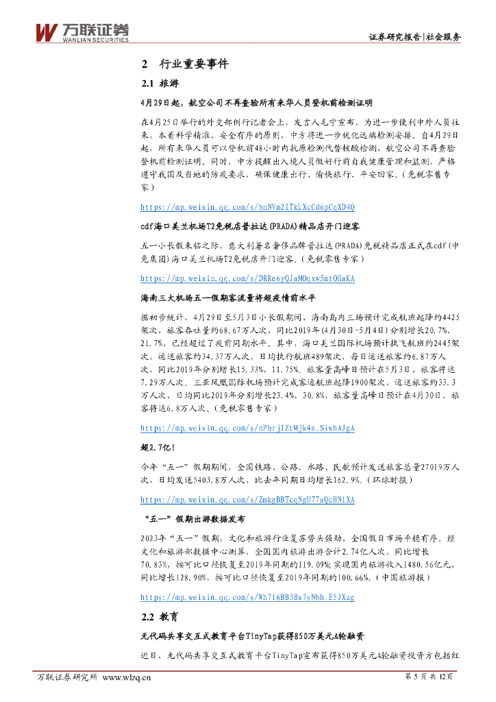万联证券:社会服务行业周观点:五一国内旅游收入同比增长128.90%,可比口径恢复至19年同期100.66%.pdf