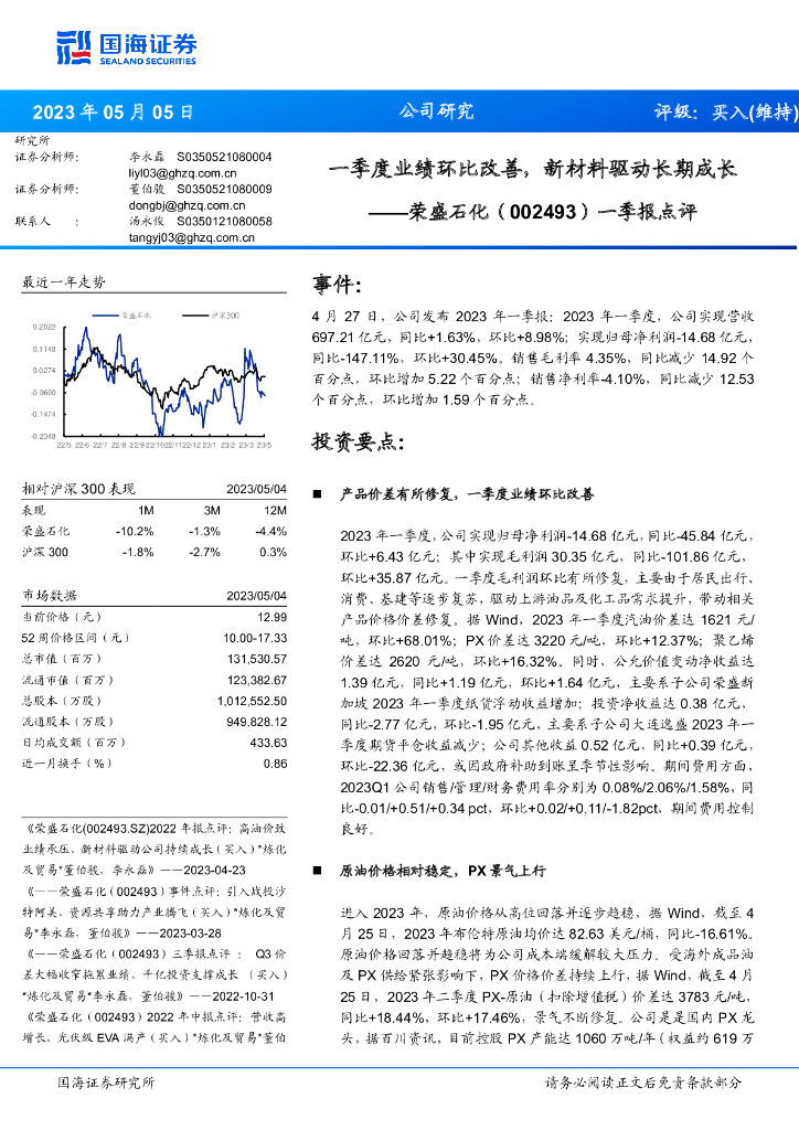 国海证券:荣盛石化(002493)-一季报点评:一季度业绩环比改善,新材料驱动长期成长.pdf