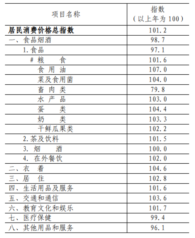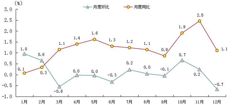 全年居民消费价格比上年上涨1.2%(详见表1),其中,食品价格下降2.9%,非食品价格上涨2.2%;服务价格上涨1.9%,消费品价格上涨0.8%。
