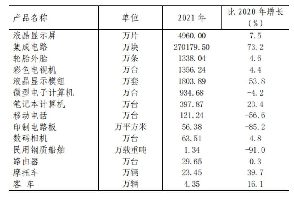 主要工业产品生产情况:全市规模以上工业企业生产集成电路27.02亿块,增长73.2%;液晶显示屏4960.00万片,增长7.5%;彩色电视机1356.24万台,增长4.4%(详见表2)。