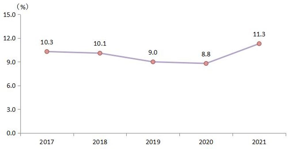 图9 2017-2021年社会消费品零售总额及其增长速度