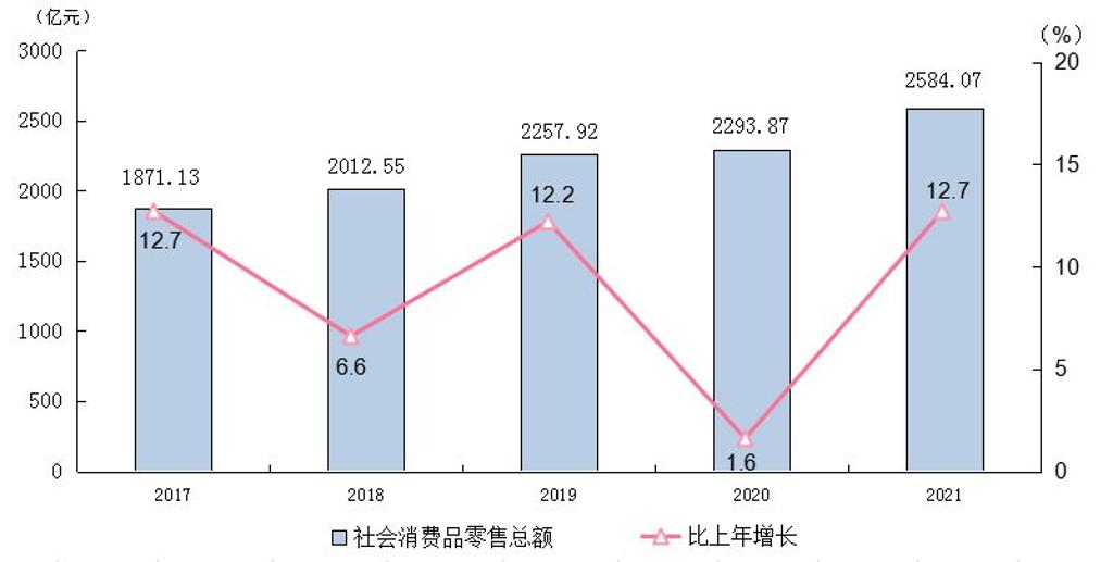 社会消费品零售总额2584.07亿元,比上年增长12.7%。按消费形态分,商品零售2313.56亿元,增长12.0%;餐饮收入270.51亿元,增长18.6%。
