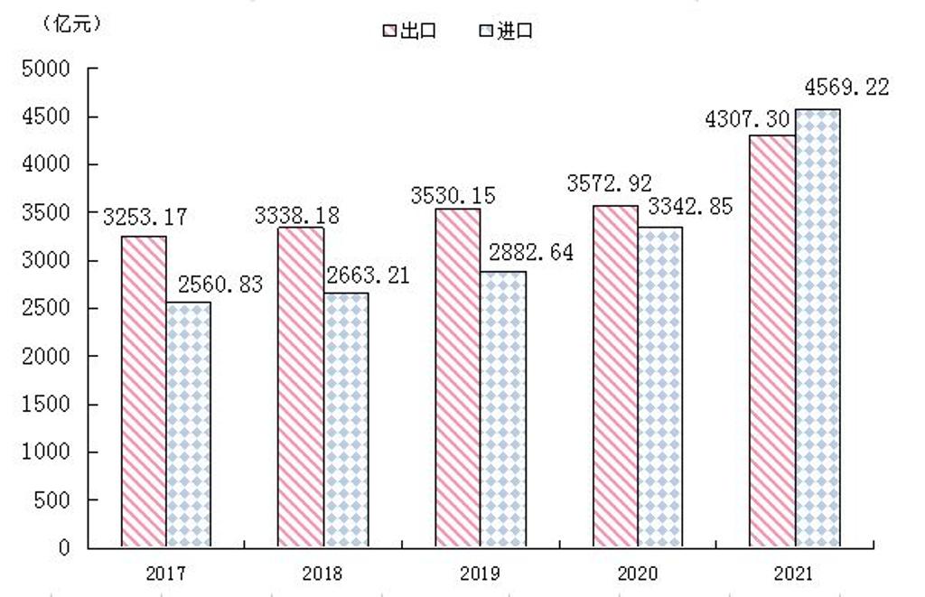 全年实现外贸进出口总值8876.52亿元,比上年增长27.7%,其中,出口4307.30亿元,增长20.6%;进口4569.22亿元,增长35.3%。