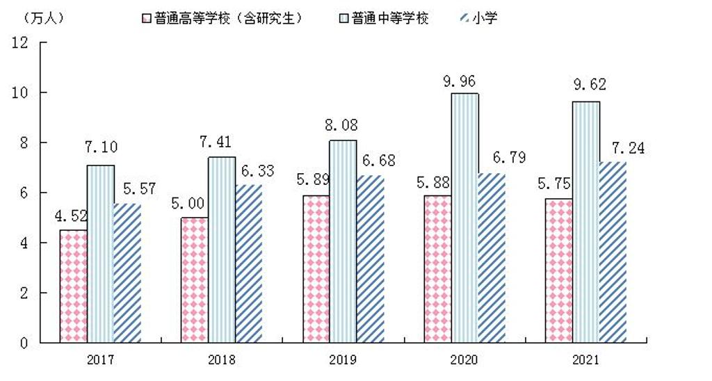 全市拥有各级各类全日制学校1500所,学年初招生数29.54万人,在校学生数107.12万人。其中,普通高等学校16所,学年初招生数(含研究生)5.75万人,在校学生数(含研究生)19.70万人;普通中等学校136所,学年初招生数9.62万人,在校学生数27.00万人;小学297所,学年初招生数7.24万人,在校学生数38.51万人;幼儿园1044所,学年初在园人数21.80万人;特殊教育学校7所,学年初在校学生1109人。在各级各类全日制学校中任职的专任教师6.41万人,平均一名教师负担学生17人。