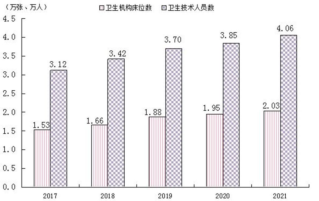 图12 2017-2021年卫生机构床位数和卫生技术人员数