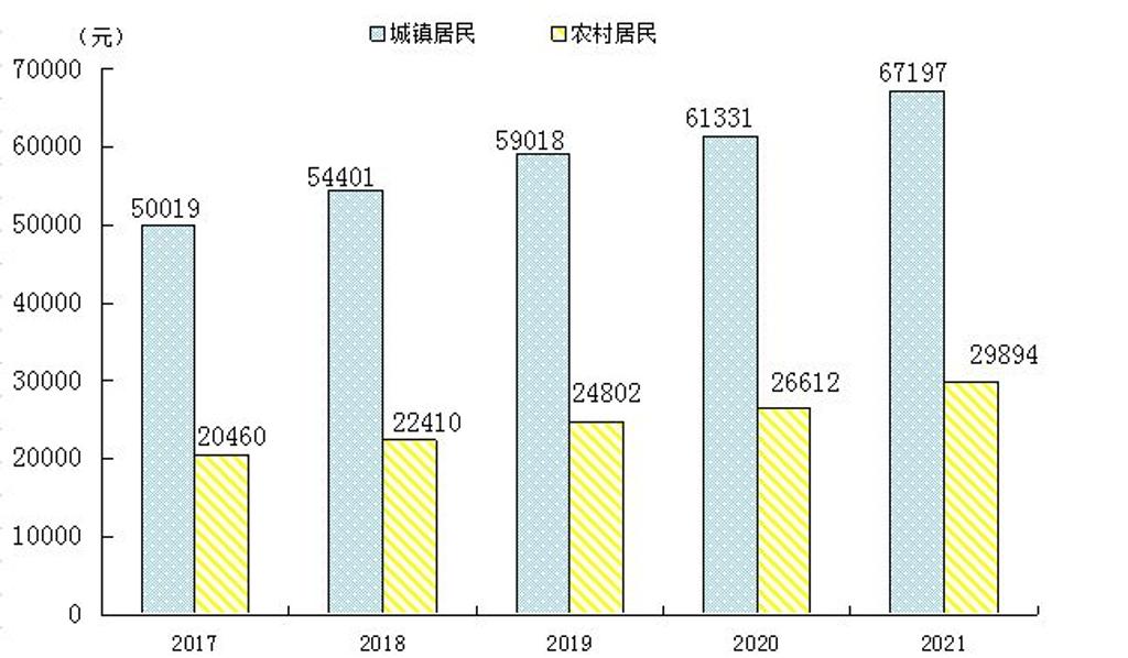 图13 2017-2021年城镇居民和农村居民人均可支配收入