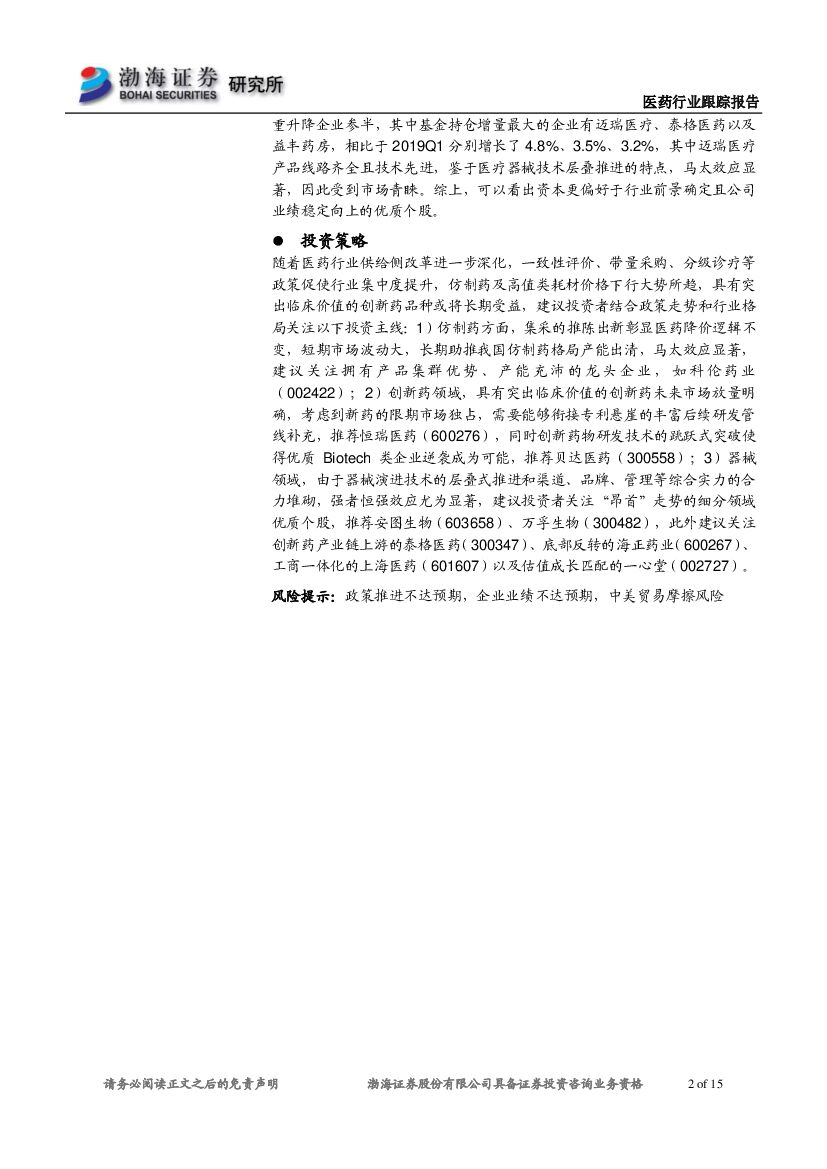 渤海证券:2019Q2医药行业基金持仓分析:政策避风港获青睐,行业集中度提升.pdf