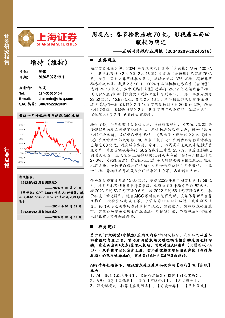 上海证券:互联网传媒行业周报-周观点:春节档票房破70亿,影视基本面回暖较为确定.pdf
