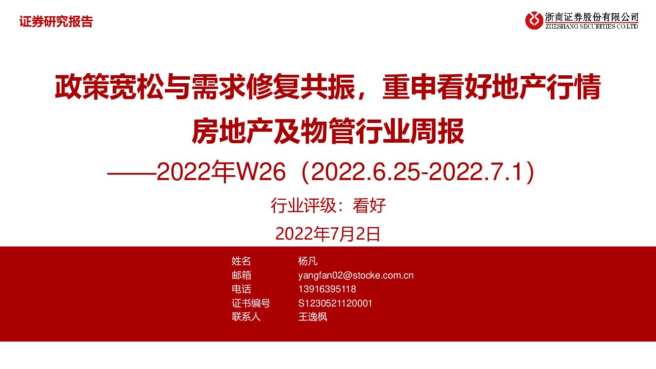 浙商证券:房地产及物管行业周报2022年W26:政策宽松与需求修复共振,重申看好地产行情.pdf