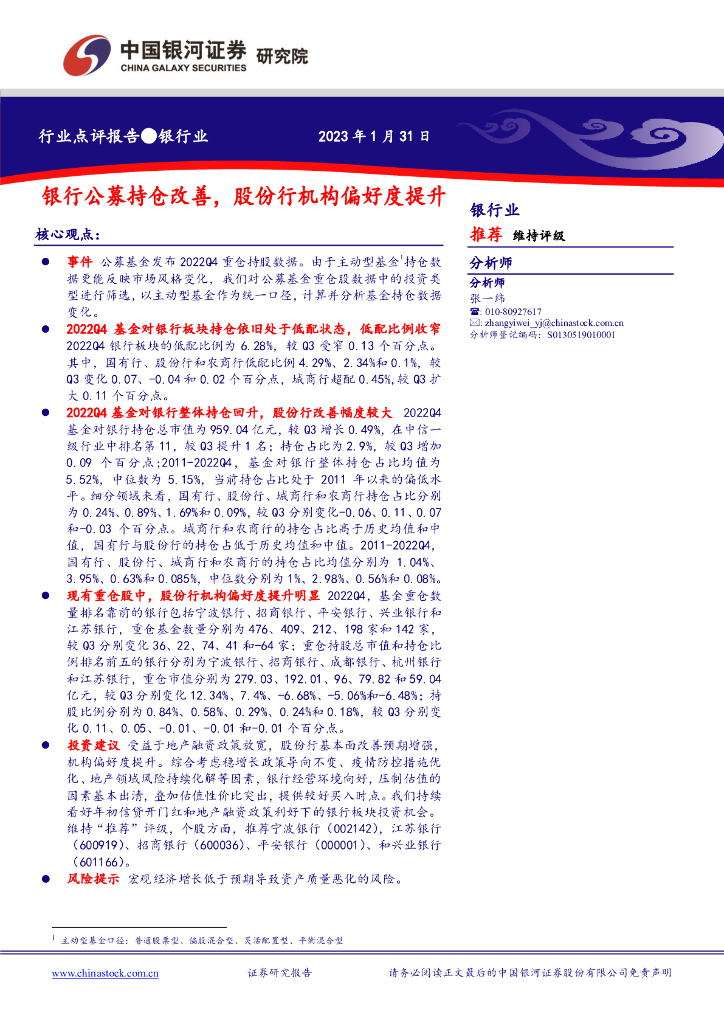 中国银河:银行业:银行公募持仓改善,股份行机构偏好度提升.pdf