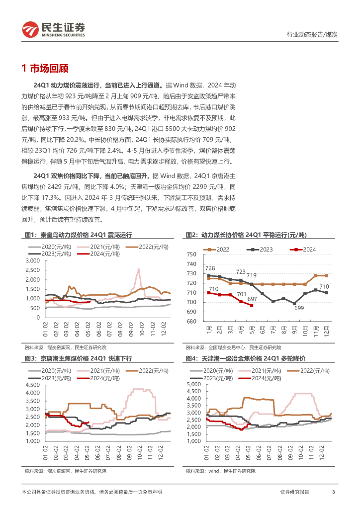 民生证券:能源开采行业2023年年报及2024年一季报总结:煤价回落致业绩短期受损,后续将迎改善.pdf