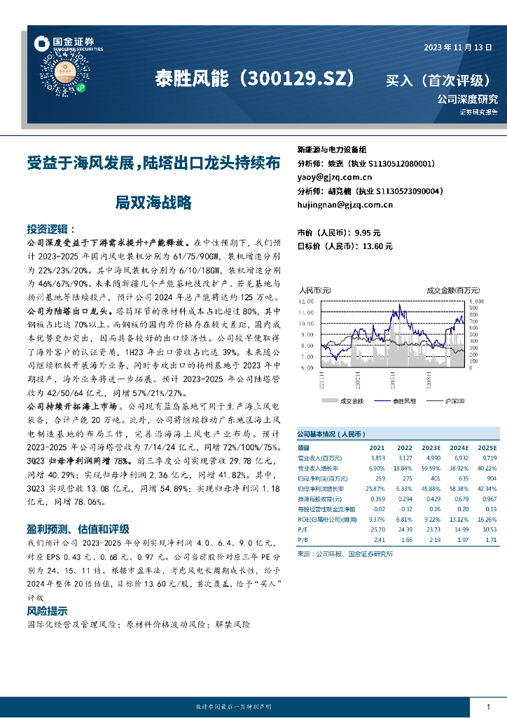 国金证券:泰胜风能(300129)-受益于海风发展,陆塔出口龙头持续布局双海战略.pdf