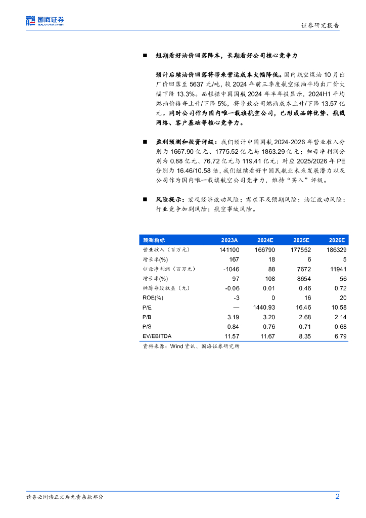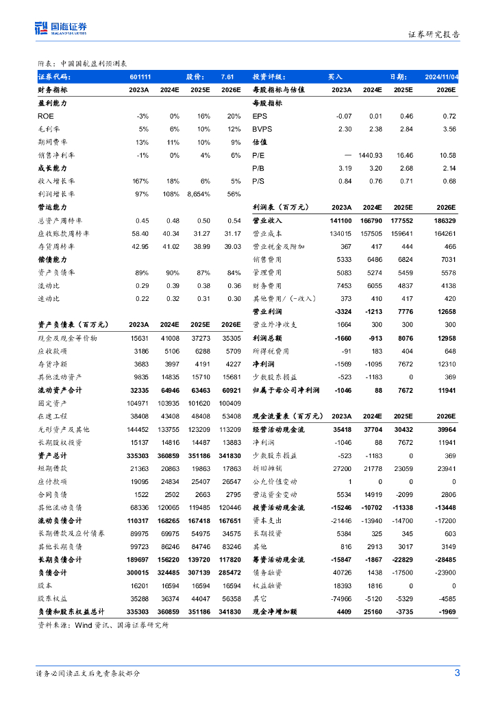 国海证券:中国国航(601111)-2024年三季报点评:Q3归母净利润41.4亿元,同比降低2.3%.pdf