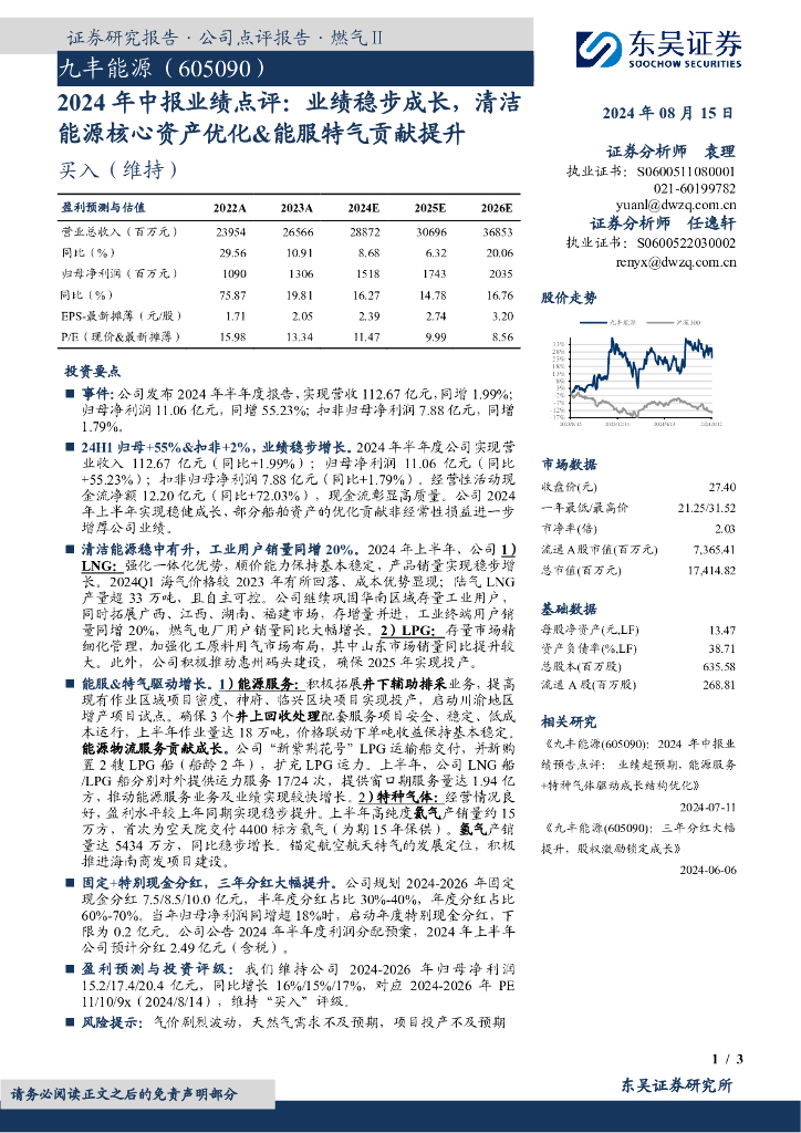 东吴证券:九丰能源(605090)-2024年中报业绩点评:业绩稳步成长,清洁能源核心资产优化&能服特气贡献提升.pdf