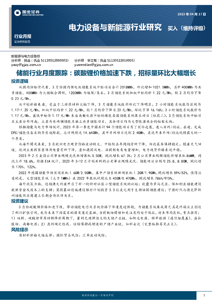 国金证券:储能行业月度跟踪:碳酸锂价格加速下跌,招标量环比大幅增长.pdf