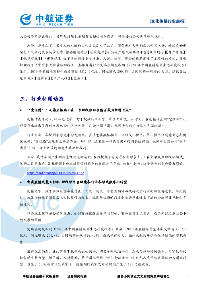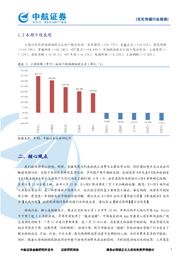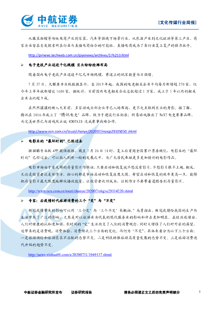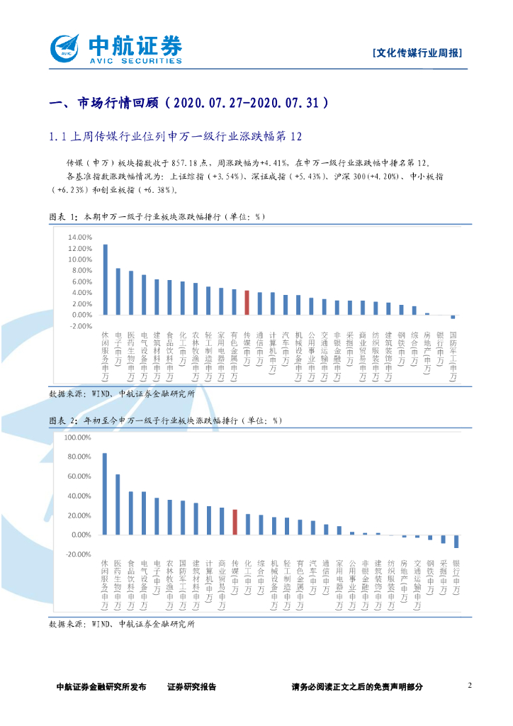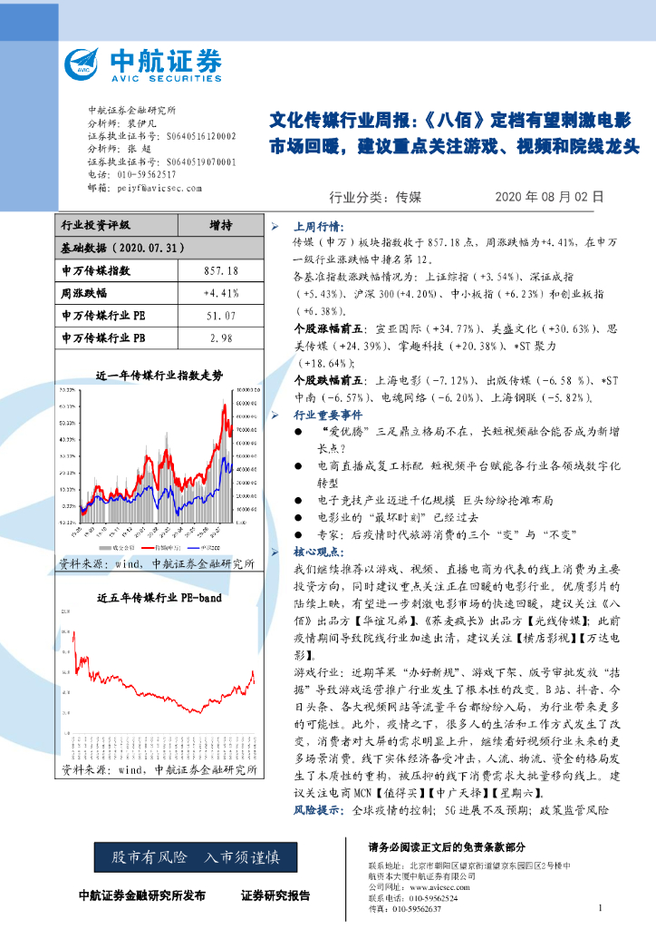 中航证券:文化传媒行业周报:《八佰》定档有望刺激电影市场回暖,建议重点关注游戏、视频和院线龙头.pdf