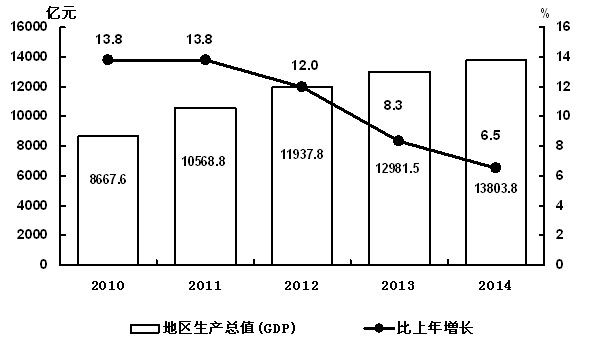 初步核算,全省实现地区生产总值[2]13803.81亿元,按可比价格计算,比上年增长6.5%。其中,第一产业增加值1524.56亿元,增长4.6%;第二产业增加值7287.26亿元,增长6.6%;第三产业增加值4991.99亿元,增长6.9%。按常住人口计算,全省人均GDP达到50162元(按年平均汇率折合8166美元),比上年增长6.5%。三次产业的结构比例为11.0:52.8:36.2,对经济增长的贡献率分别为6.8%、55.6%和37.6%。