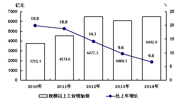2014年,规模以上工业增加值6492.93亿元,比上年增长6.6%。其中,轻工业实现增加值1997.18亿元,增长7.8%;重工业实现增加值4495.75亿元,增长6.0%。分经济类型看,国有及国有控股企业实现增加值1361.56亿元,增长5.2%,集体企业实现增加值24.44亿元,增长9.5%,外商及港澳台商投资企业实现增加值706.06亿元,增长2.3%。