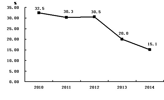 2014年,全省化学需氧量(COD)排放量74.30万吨,比上年下降2.39%;氨氮排放量5.30万吨,比上年下降3.04%;二氧化硫(SO2)排放量37.23万吨,比上年下降2.42%,氮氧化物排放量控制在54.92万吨,比上年下降2.01%。