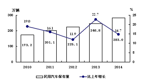 年末,全省民用汽车保有量达到282.97万辆,比上年末增长14.7%。其中,全省私人汽车保有量249.41万辆,增长14.5%,其中,私人轿车保有量146.47万辆,增长19.2%。