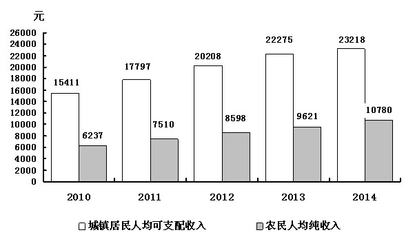 2014年,全省城镇常住居民人均可支配收入达到23217.8元,比上年增长8.8%;城镇居民人均消费性支出为17156元,增长7.6%。农村常住居民人均可支配收入达到10780.1元,增长10.2%。城镇恩格尔系数为26.1%,农村恩格尔系数为29.6%。