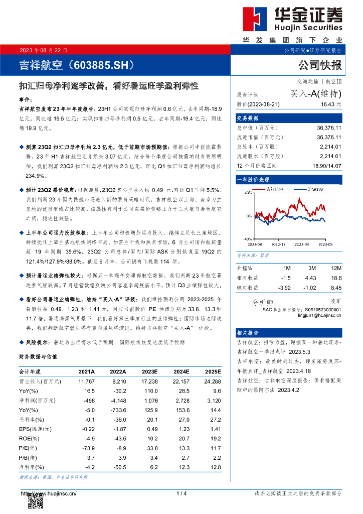 华金证券:吉祥航空(603885)-扣汇归母净利逐季改善,看好暑运旺季盈利弹性.pdf