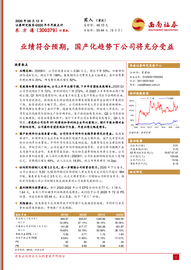 西南证券:东方通(300379)-2020年半年报点评:业绩符合预期,国产化趋势下公司将充分受益.pdf