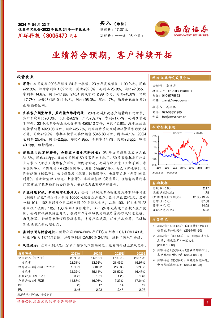 西南证券:川环科技(300547)-业绩符合预期,客户持续开拓.pdf