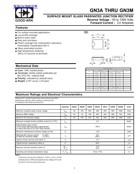 GOOD-ARK GN3A THRU GN3M SURFACE MOUNT GLASS PASSIVATED JUNCTION RECTIFIER Reverse Voltage - 50 to 1000 Volts Forward Current - 3.0 Amperes 数据手册.pdf