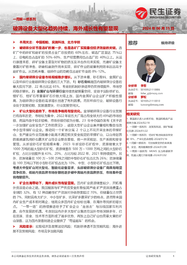 民生证券:机械一周解一惑系列:破筛设备大型化趋势持续,海外成长性有望显现.pdf