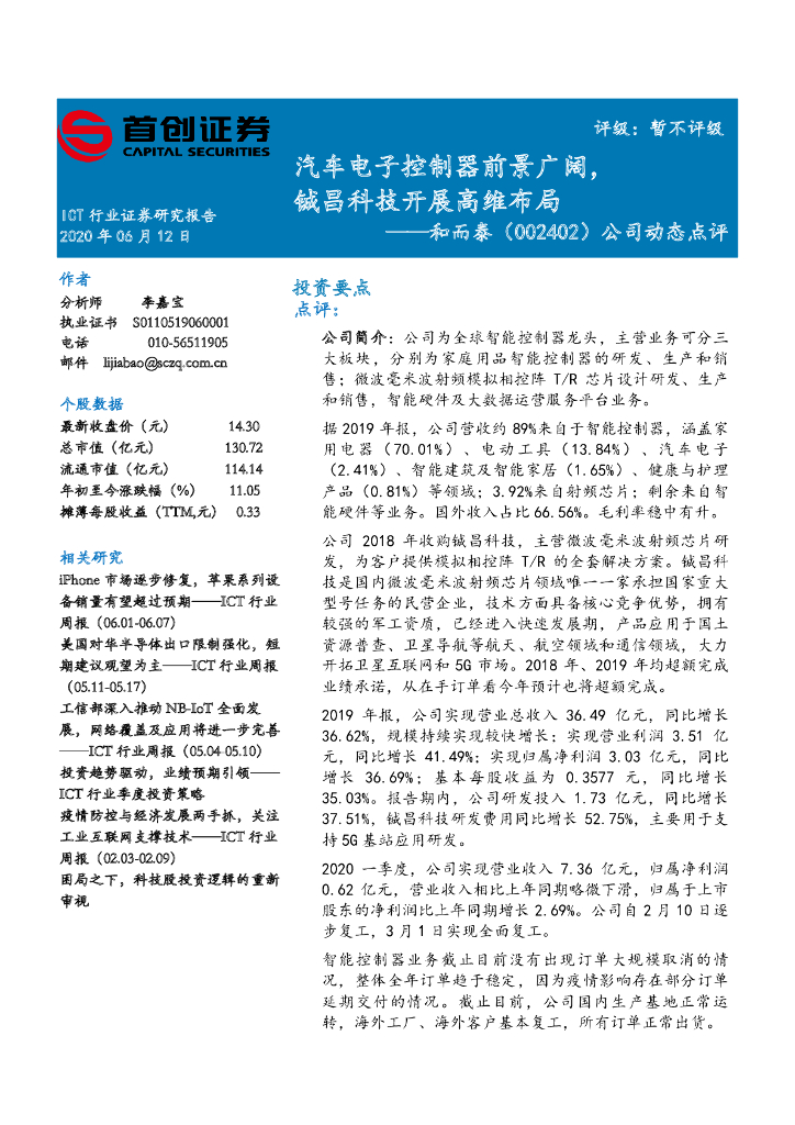首创证券:和而泰(002402)-公司动态点评:汽车电子控制器前景广阔,铖昌科技开展高维布局.pdf