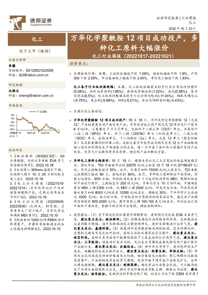 德邦证券:化工行业周报:万华化学聚酰胺12项目成功投产,多种化工原料大幅涨价.pdf