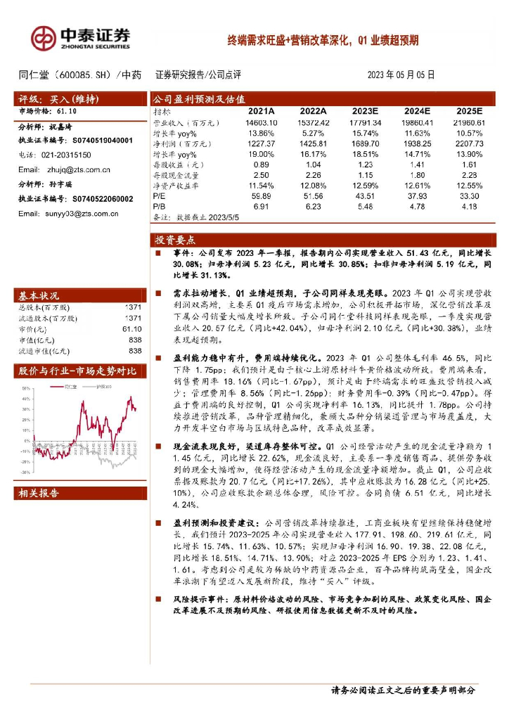 中泰证券:同仁堂(600085)-终端需求旺盛+营销改革深化,Q1业绩超预期.pdf