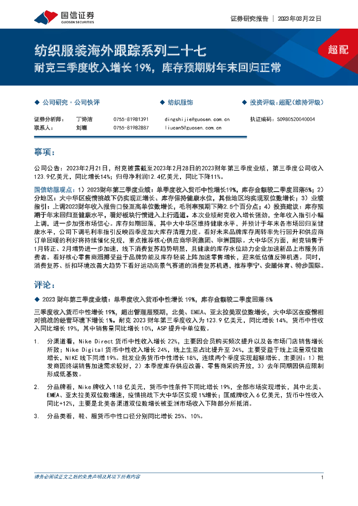 国信证券:纺织服装海外跟踪系列二十七:耐克三季度收入增长19%,库存预期财年末回归正常.pdf