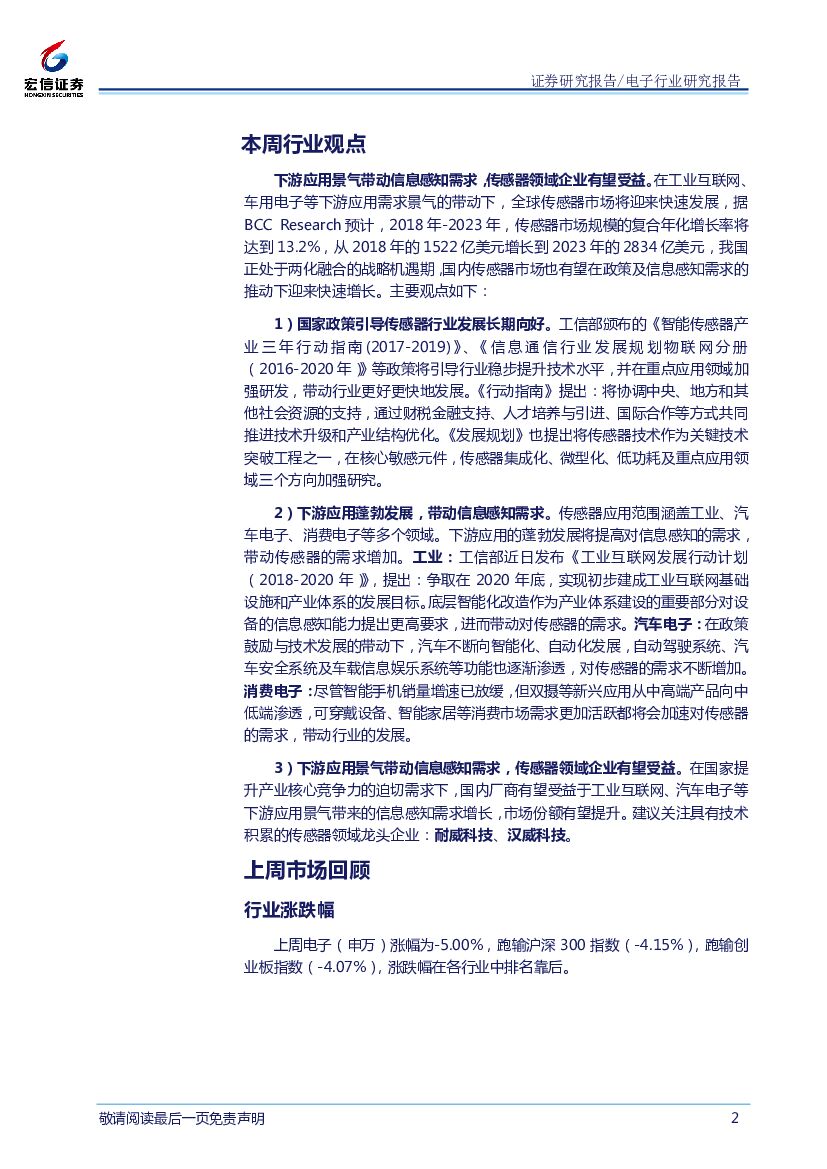 宏信证券:电子行业周报:下游应用景气带动信息感知需求,传感器领域企业有望受益.pdf
