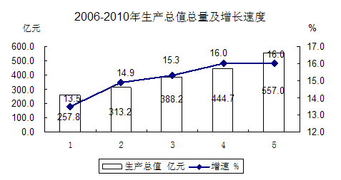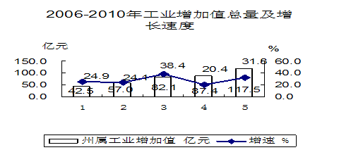 国民经济继续保持较快增长。预计2010年我州实现生产总值557亿元,按可比价计算增长16.0%,增速与上年持平。人均生产总值34817元,同比增长13.1%。第一产业完成增加值163亿元,增长7.2%;第二产业完成增加值236.7亿元,增长25.4%,其中工业完成增加值189.3亿元,增长27.0%;第三产业完成增加值157.4亿元,增长11.8%。三次产业结构为29.3:42.5:28.2。三次产业分别拉动经济增长2.0、10.3和3.7个百分点,其中工业拉动8.7个百分点。