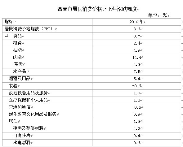 全年物价稳中有升。昌吉市居民消费价格(CPI)比上年增长3.6%,其中:食品类价格上涨8.7%;非食品价格上涨0.9%;消费品价格上涨4.0%;服务价格上涨1.4%。扣除食品和能源的价格上涨0.7%。商品零售价格上涨4.0%。