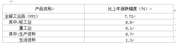 工业品出厂价格指数(PPI)比上年上涨7.72%,生产资料价格指数上涨9.7%,生活资料价格指数上涨1.2%。