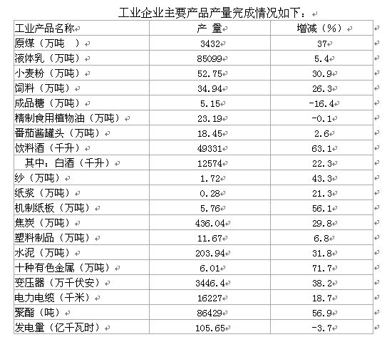 全年完成工业增加值118亿元(不含兵团、石油天然气),较上年同比增长31.8%,其中规模以上工业企业(主营业务收入500万元以上的企业)完成增加值100亿元,增长31%。在规模以上工业增加值中,轻工业26亿元,增长39%,重工业74亿元,增长28.4%。