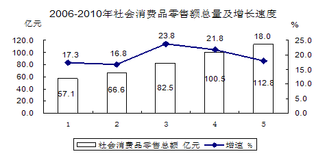 在“家电下乡”、“汽车下乡”等补贴措施和完善“万村千乡”市场工程的推动下,在居民消费需求稳定增长的利好环境下,全州消费市场继续走旺,热点频现。全年社会消费品零售总额112.8亿元,比上年增长18.1%。分城乡看,城市消费品零售额96.5亿元,增长18.1%;农村消费品零售额16.3亿元,增长18.2%。分行业看:批发业零售额9.9亿元,增长24.2%;零售业零售额85.1亿元,增长17.0%;住宿业零售额0.7亿元,增长37.8%;餐饮业零售额17.1亿元,增长19.6%。