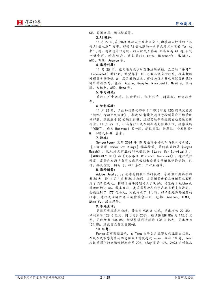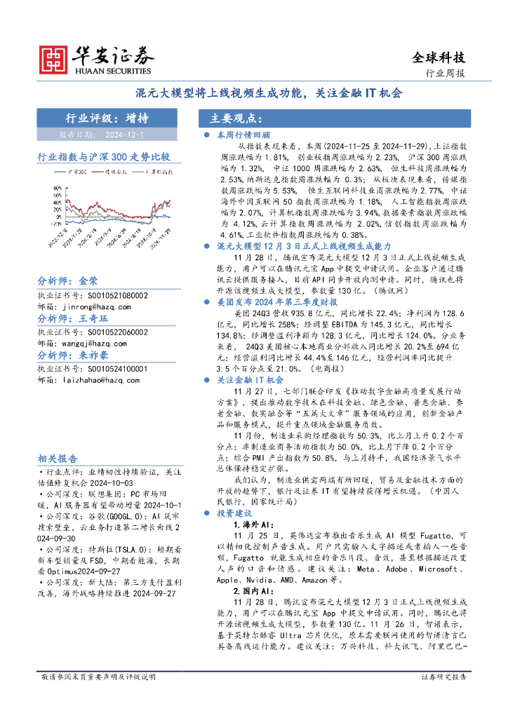 华安证券:全球科技行业周报:混元大模型将上线视频生成功能,关注金融IT机会.pdf
