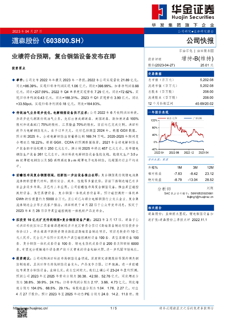 华金证券:道森股份(603800)-业绩符合预期,复合铜箔设备发布在即.pdf