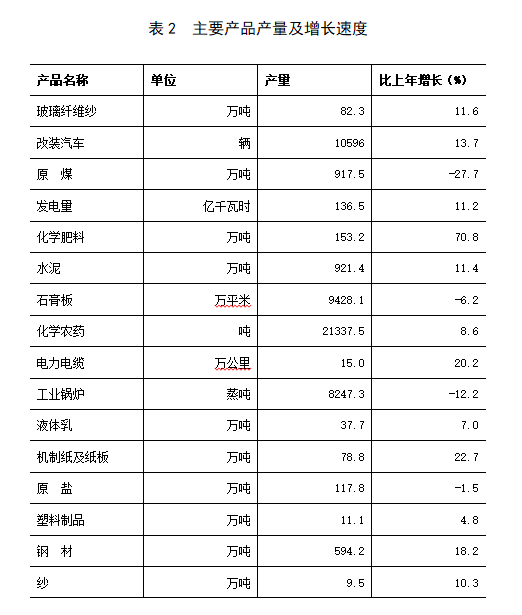工业发展保持稳定。工业实现增加值784.9亿元,按可比价比上年增长7.0%,占GDP的26.2%。从规模以上工业看,规模以上工业增加值比上年增长8.3%,其中轻工业增长19.1%,重工业增长5.5%;37个在统大类行业有29个行业增加值比上年增长,增长面为78.4%;实现营业收入2717.3亿元,增长21.0%,利润总额151.4亿元,增长51.0%,利润率5.6%,比上年提高1.1个百分点;工业产品产销率98.9%。