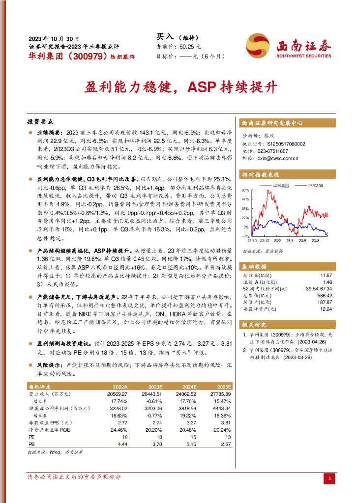 西南证券:华利集团(300979)-2023年三季报点评:盈利能力稳健,ASP持续提升.pdf