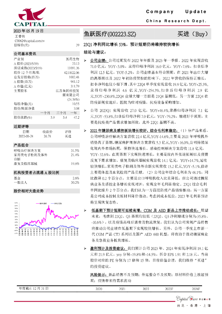 群益证券:鱼跃医疗(002223)-23Q1净利同比增长53%,预计短期仍将维持较快增长.pdf