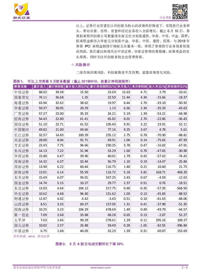 联讯证券:【联讯非银】上市券商5月业绩点评:环比继续下滑,投行业务增长可期.pdf