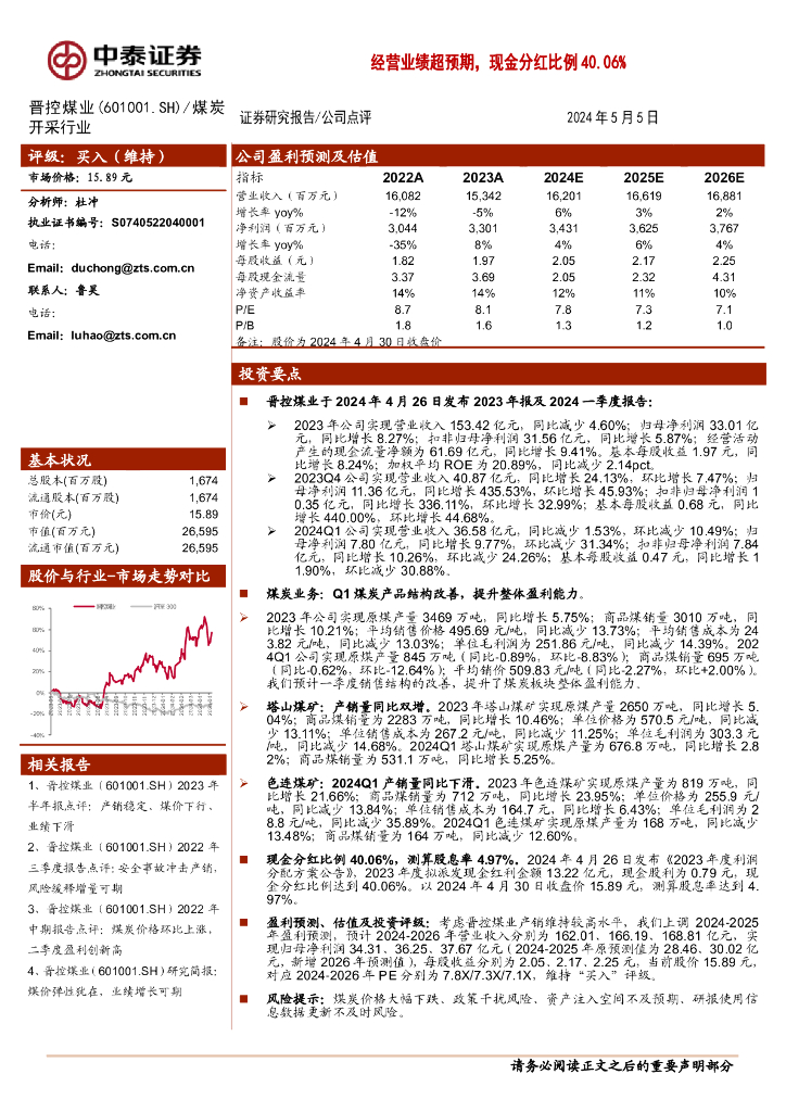 中泰证券:晋控煤业(601001)-经营业绩超预期,现金分红比例40.06%.pdf